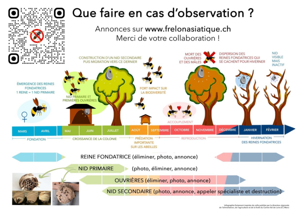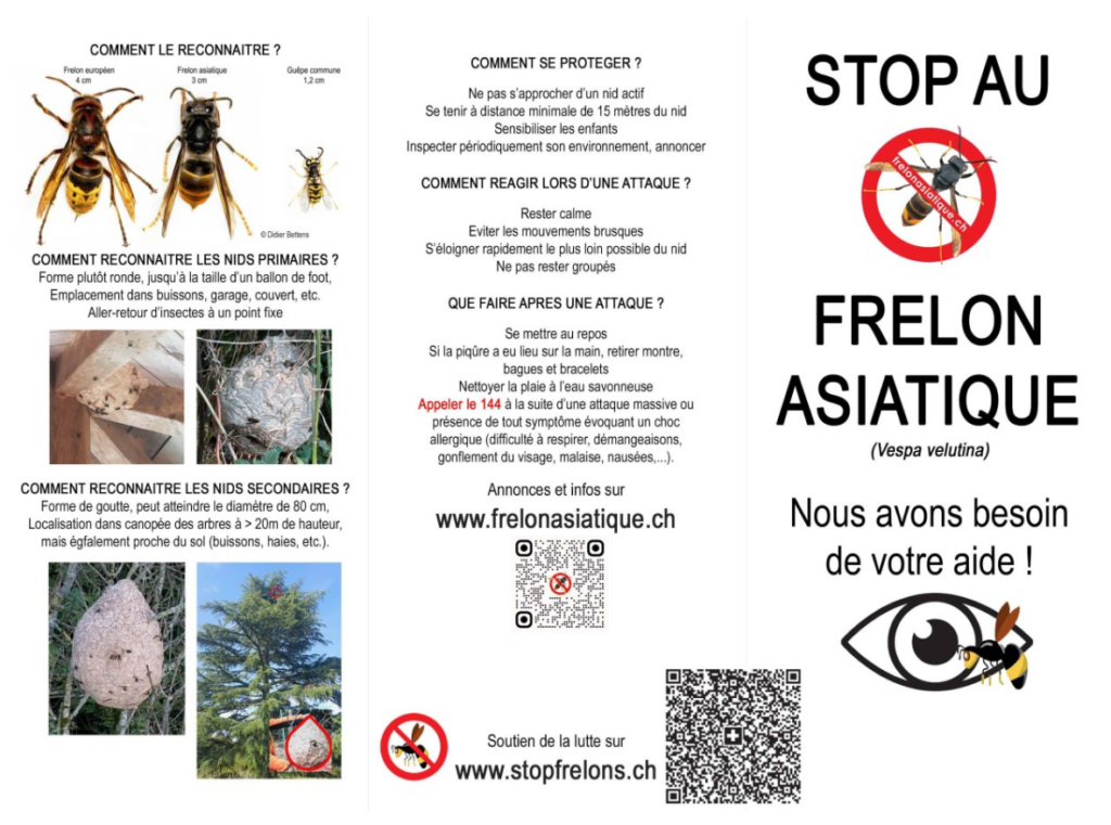 Comme le frelon asiatique se nourrit en priorité d’abeilles mellifères afin de couvrir son énorme besoin en protéines pour alimenter ses larves, les apiculteurs sont concernés en premier lieu par cette espèce invasive. Cependant, le travail bénévole des apiculteurs ne suffira pas pour endiguer cette invasion et la Fédération Fribourgeois des sociétés d’Apiculture (FFA) fait appel aux communes et à la population pour les soutenir dans cette lutte soit grâce à des dons (le lien se trouve sur le site StopFrelonFribourg) soit en s’annonçant comme bénévole pour participer à la recherche de nids.